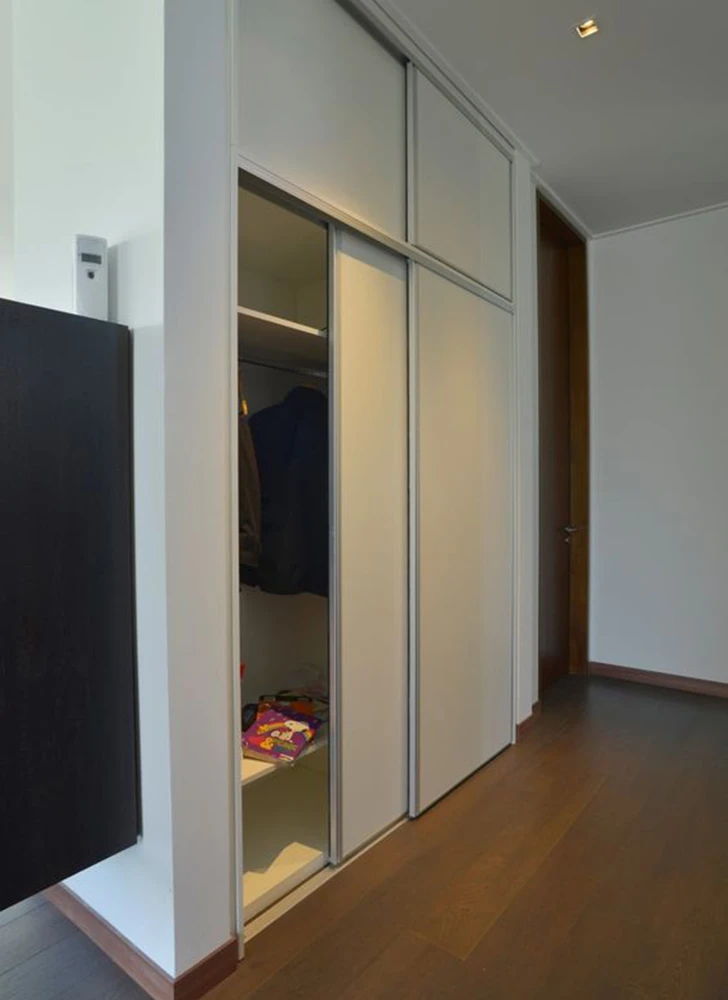 Producto de fácil instalación que permite un mejor aprovechamiento del espacio. Se fabrica con una guía superior, inferior y bastidor de hoja en aluminio blanco o anodizado natural (otros colores a consultar). Ruedas regulables con rodamientos, anti vibradores superiores y felpas.